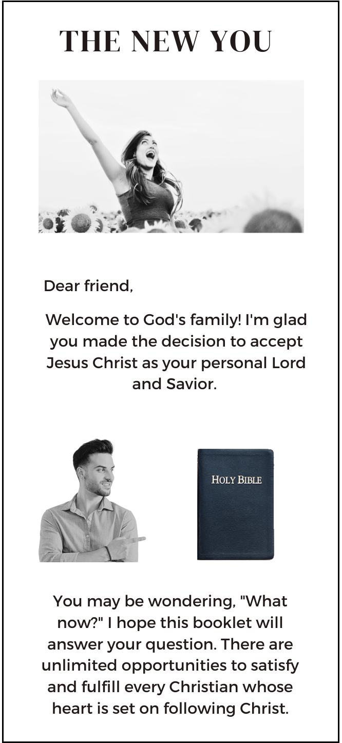 You have heard of Gospel tracts to share the Gospel. Here is a New Birth tract written for new Christians. Leave this with a new Christian or potential disciples and Bible study participants. This is an effective way of leaving a simple pamphlet of important information about spiritual growth. The seven topics briefly share truths and Bible verses about what God expects Christians to do. Ready to print and fold.